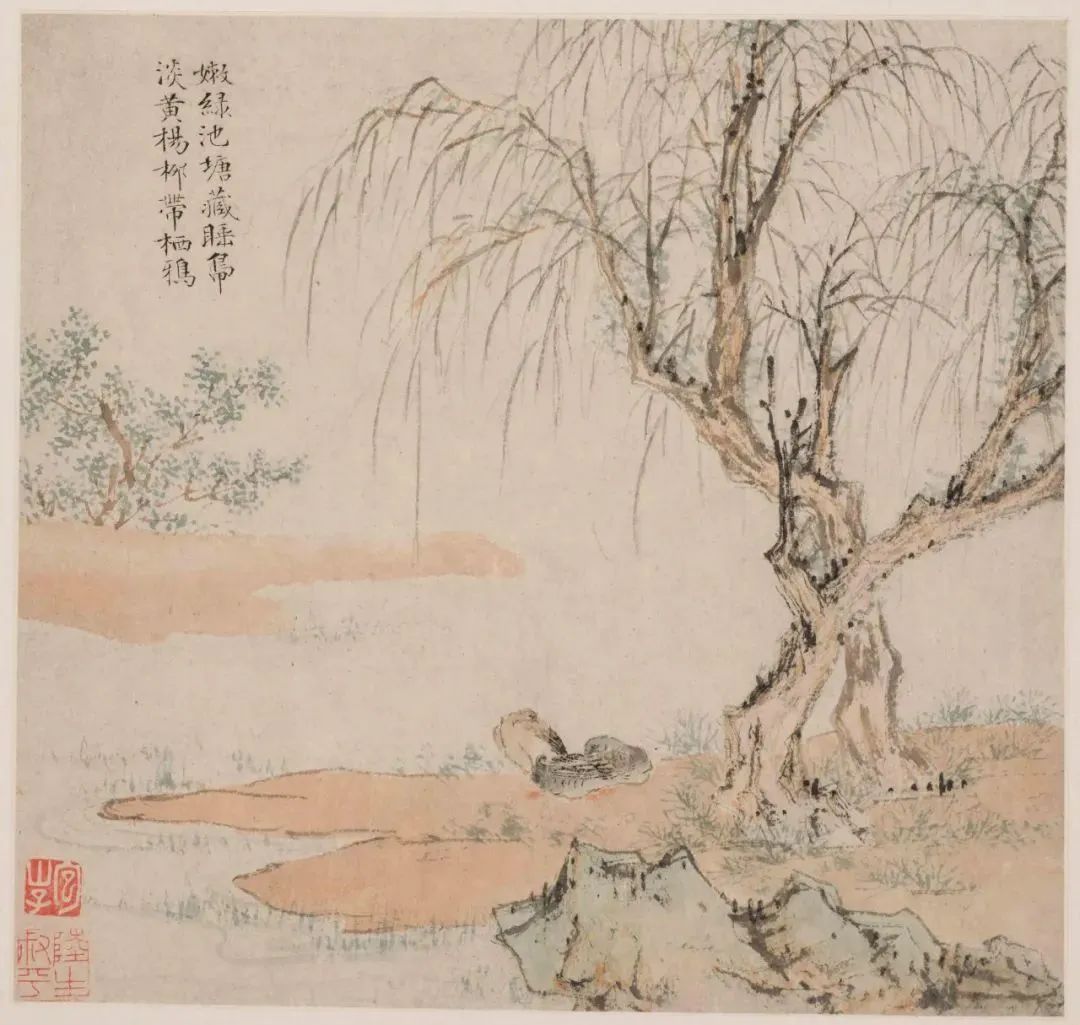 嫩绿池塘藏睡鸭,淡黄杨柳带栖鸦。